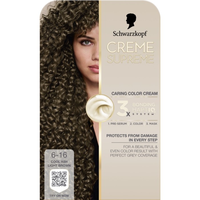 Schwarzkopf Creme Supreme 6-16 Cool Ash Light Brown är en vårdande hårfärg med ett 3x bonding HaptIQ System som förbereder, skyddar och stärker håret för ett vackert och jämnt färgresultat med 80% gråhårstäckning.