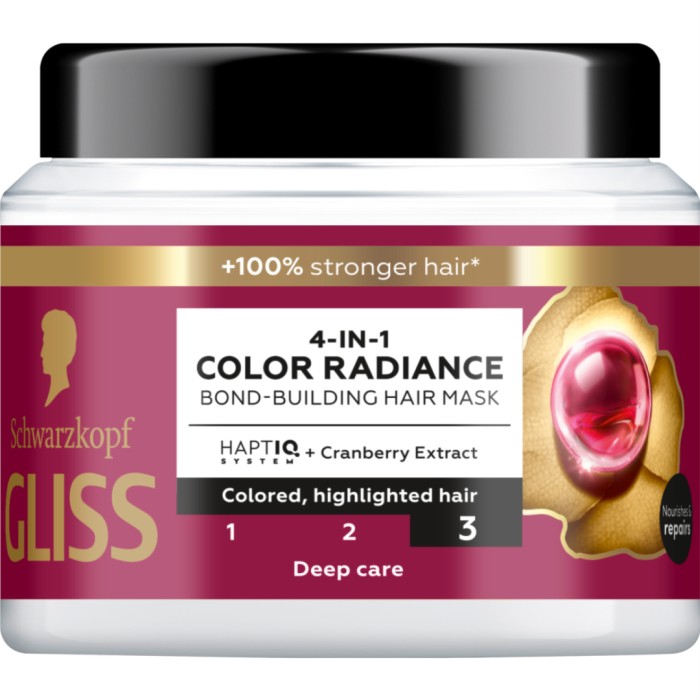 Färgat hår förlorar sin livfulla färg genom frekvent hårtvätt. För att hjälpa håret att bibehålla sin intensiva färg och lyster kan man prova en hårbehandling som Gliss Color Perfector Mask. Inpackningen kombinerar HAPTIQ-systemet och tranbärsextrakt för att ge djup hårreparation, färgskydd upp till 13 veckor och långvarig färglyster (jämfört med obehandlat hår). Gliss-inpackningen har en lätt och krämig konsistens och ger intensiv näring till håret, samtidigt som håret får glans. Gliss hårvårdsbehandling med HAPTIQ-system skapar mikrobindningar och stärker hårstrukturen. Kan användas på fyra sätt: som förschampo före hårtvätt; som balsam som hårmask, eller som leave-in. Innehåller 97 % ingredienser av naturligt ursprung.
