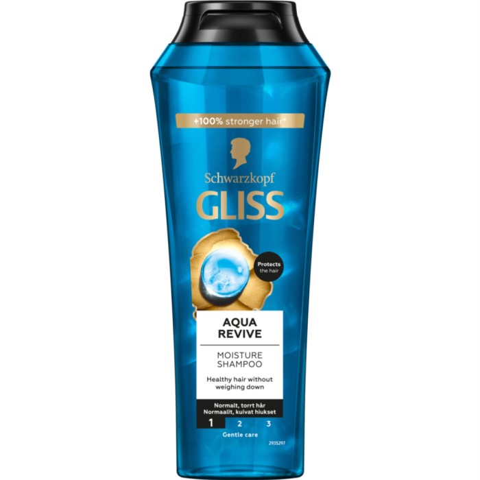 Gliss Moisture Shampoo Aqua Revive är ett hårschampo från Schwarzkopf. Det djupt återfuktande schampot passar normalt till torrt hår. Schampot är framtaget för att ge en synligt förbättrad hårkvalitet, och det fuktgivande schampot gör håret glansigt utan att tynga ner det. Aqua Revive Moisture Shampoo innehåller hyaluron och havsalg som återfuktar håret, och lämnar en återfuktad känsla i upp till 48 timmar* (*i kombination med GLISS Aqua Revive Conditioner). Schampot kan användas dagligen. Innehåller 90% ingredienser av naturligt ursprung (inklusive vatten).
