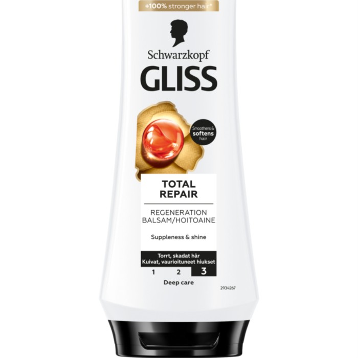 Gliss Regeneration Total Repair Conditioner från Schwarzkopf är ett djupt vårdande hårbalsam för torrt hår, speciellt utvecklat för att vårda stressat hår. Balsamet innehåller keratin för att reparera håret på djupet, utan att tynga ned det. Balsamet ingår i Total Repair-serien, en vårdande kollektion av kvalitativa hårprodukter som innehåller hydrolyserat keratin och blomnektar och är speciellt anpassat för att ta hand om stressat och torrt hår, och skydda hårfibrerna. Ger färre avbrutna hårstrån och gör håret mer välmående.