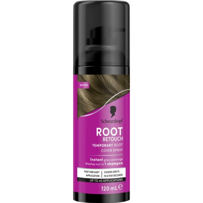Schwarzkopf Root Retouch Brown är en tillfälligt täckningsspray för hårrötter för upp till 40 användningar.
