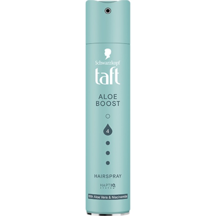 Taft Aloe Boost Hairspray från Schwarzkopf är en hårspray med aloe vera och niacinamid som passar alla hårtyper. Den innovativa Taft-hårsprayen innehåller en Aloe Boost-formulering som ger håret styrka och vård för långvarig stadga och en slät finish utan att klibba.