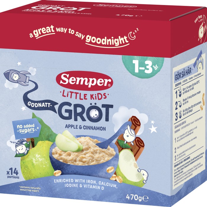 Godnattgröt äpple & kanel görs på havre och vete och passar barn, 1–3 år. Den klassiska smakkombinationen äpple och kanel gör att gröten lätt blir en favorit hos de flesta barn. Godnattgröten bäddar för en mysig godnattstund, men Semper gröt passar faktiskt när som helst under dagen eftersom den är näringsmässigt komplett! Fullkornshavre innehåller dessutom en blandning av lösliga och olösliga fibrer. Godnattgröten är enkel att tillreda såväl hemma som borta, blanda bara med vatten. Ju större ditt barn blir, desto mer fibrer innehåller gröten. Vi har också sett över och justerat frukt- och bärinnehållet i våra recept så att barn ska vänja sig vid en mindre fruktig smak på gröten.