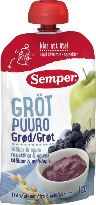 Grötklämmis med frukt och bär från Semper. Sempers ätklara gröt med blåbär och äpple är ett mättande mellanmål i klämpåse. Lätt att äta utan kladd och spill och enkel att ta med sig. Semper klämmisar med fruktgröt innehåller minst 50 % gröt, har inget tillsatt socker och innehåller bland annat järn, kalcium och vitamin C. Passar bra som ett mellanmål. Servera gärna klämmisen från sked. För barn från 6 månader.