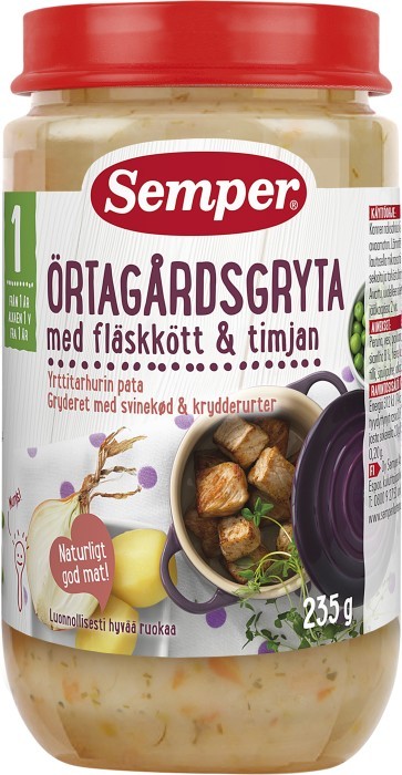Semper Örtagårdsgryta med potatis, barnmat i glasburk passar barn från 1 år. Passar bra för barn som har börjat äta barnmat på burk. Örtagårdsgryta med potatis är god, vällagad och näringsmässigt anpassad barnmat, med lite större bitar i, en konsistens som passar barnets ålder.