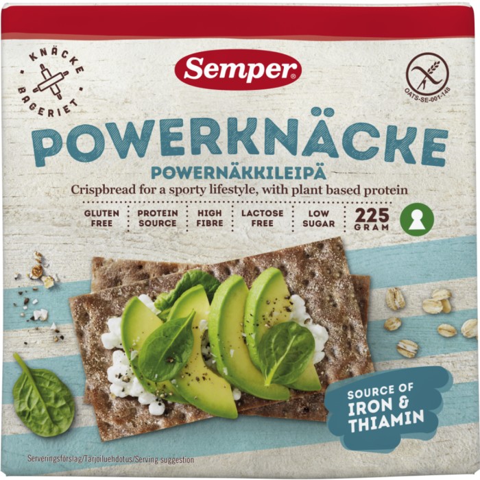 Semper Powerknäcke är ett glutenfritt knäckebröd med 21 % fullkornshavre och protein, framtaget för att passa dig med en aktiv livsstil. Powerknäcke är ett knaprigt knäckebröd med hög fiberhalt och är berikat med järn och tiamin. Kan bli en del av frukosten, eller tas när du behöver ett stadigt mellanmål. Brödet är toppat med betfiber och bakat på traditionellt sätt i stenugn.
