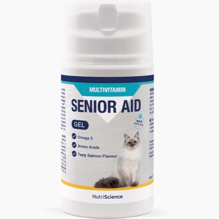 Hos äldre katter kan det daglig intaget av föda förändras, kanske pga sjukdom eller minskad aptit. Ett tecken på åldrandet kan vara att katten får en lägre aktivitetsnivå, sover längre och leker mindre. SeniorAid är vetenskapligt framtaget av NutriScience och innehåller viktiga ingredienser som kan bidra till att bromsa kattens åldrande.