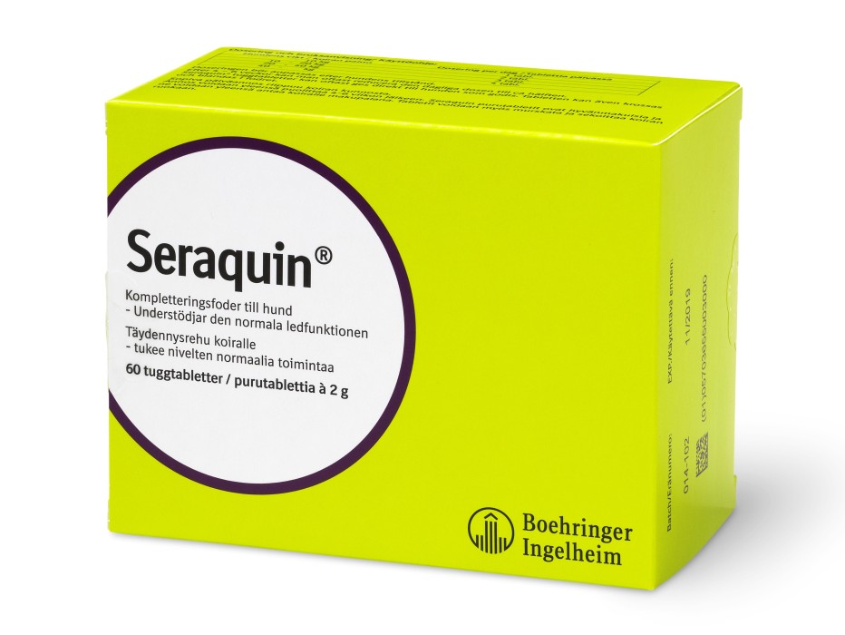 Seraquin är ett naturligt fodertillskott som understödjer den normala funktionen i ledbrosk, ledkapslar, senor och ledband hos hundar och katter. Den styrker och underhåller rörelseapparaten och kan hålla djuret friskt och aktivt längst möjligt. God smaklighet.
