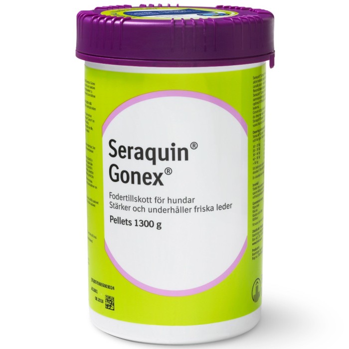 Seraquin Gonex är ett naturligt fodertillskott som understödjer den normala funktionen i ledbrosk, ledkapslar, senor och ledband hos hundar. Seraquin Gone styrker och underhåller rörelseapparaten och kan hålla djuret friskt och aktivt längst möjligt.