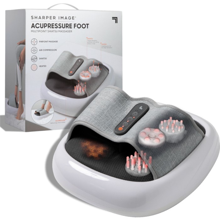 Acupressure Foot Multipoint Shiatsu Massager från Sharper Image är en massageapparat som ger en stimulerande och djupgående fotmassage till hålfot och fotsula. Fotmassagen ger en skön shiatsumassage med kompression, akupressur och värmeterapi, som lindrar trötta och ömma fötter. Fotmassagen kan användas vid hälsporre.