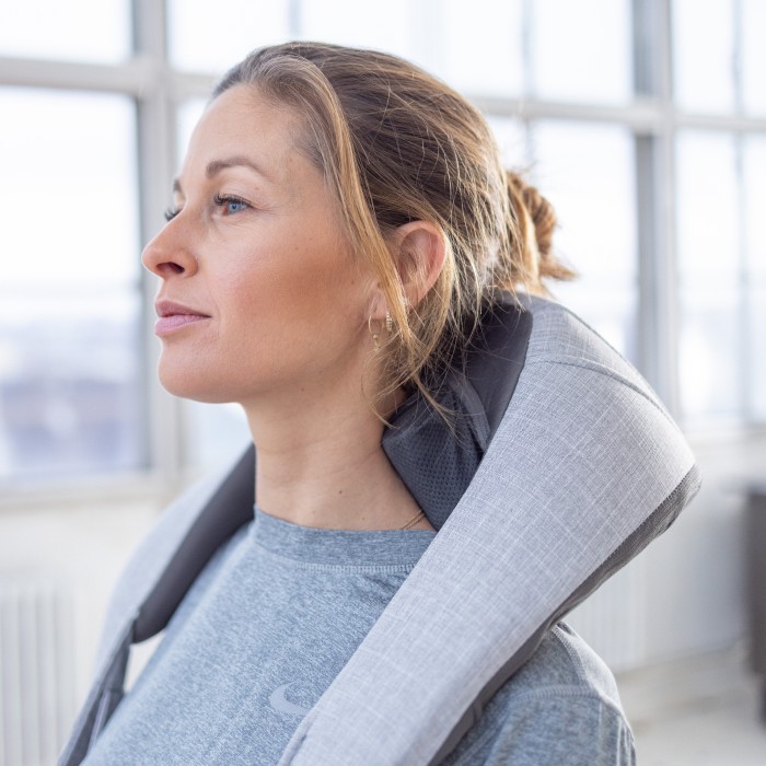 Realtouch Shiatsu Massage Neck & Back från Sharper Image är en massageapparat som har fyra gelmassageknoppar som ger en shiatsumassage med valfri värmeterapi, för att mjukgöra och lösa upp muskelspänningar i hela kroppen. De fyra massagehuvudena arbetar för att ge dig en bra massage och är framtagna för att likna känslan av riktiga fingertoppar. Massagen kan förstärkas genom att lägga vikt på armremmarna och kan justeras mellan tre olika nivåer och massageriktningen kan ändras.