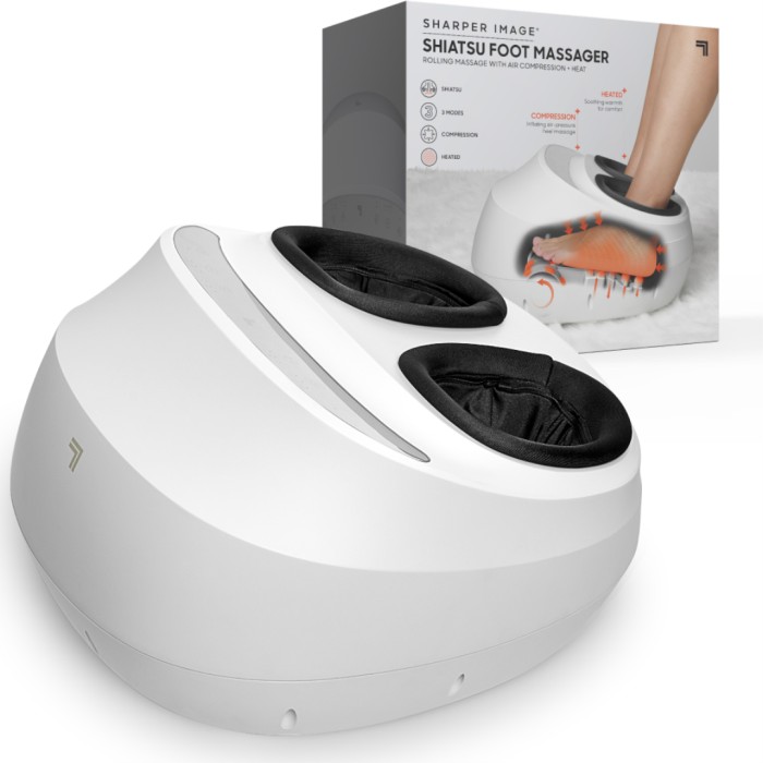 Sharper Image Shiatsu Foot Massager är en fot-massageapparat som lindrar ömma och trötta fötter. Med ett behagligt kompressionstryck ger apparaten en skön massage av både fotrygg, fotsulor, hålfot och häl. Slappna av och känn massageknopparna arbeta medan dina kalla och trötta fötter värms upp och blir mindre spända.