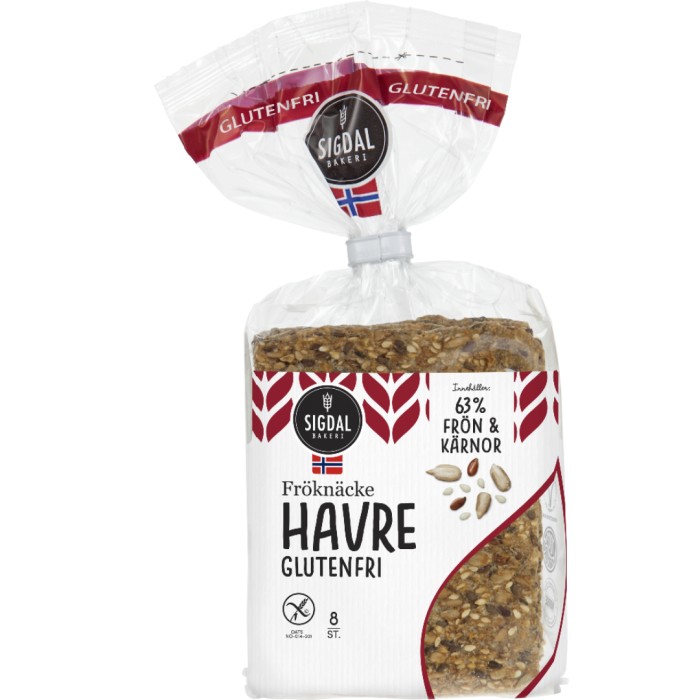 Sigdal Fröknäcke Glutenfri Havre är ett glutenfritt fröknäcke med havre. Kombinationen av havre och fröer ger knäcket en rund och fyllig smak. Perfekt att äta till frukost med pålägg på. Förpackningen innehåller 8 st skivor knispigt knäckebröd.