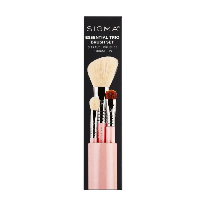 Sigma Beauty Essential Trio Brush Set kan du använda för att snabbt och enkelt fixa till sminket. Det praktiska borstsetet i resestorlek innehåller en vinklad ansiktsborste och två klassiska ögonborstar i en praktisk förpackning. Perfekt för såväl nybörjare som proffs. Borstarna är veganska.