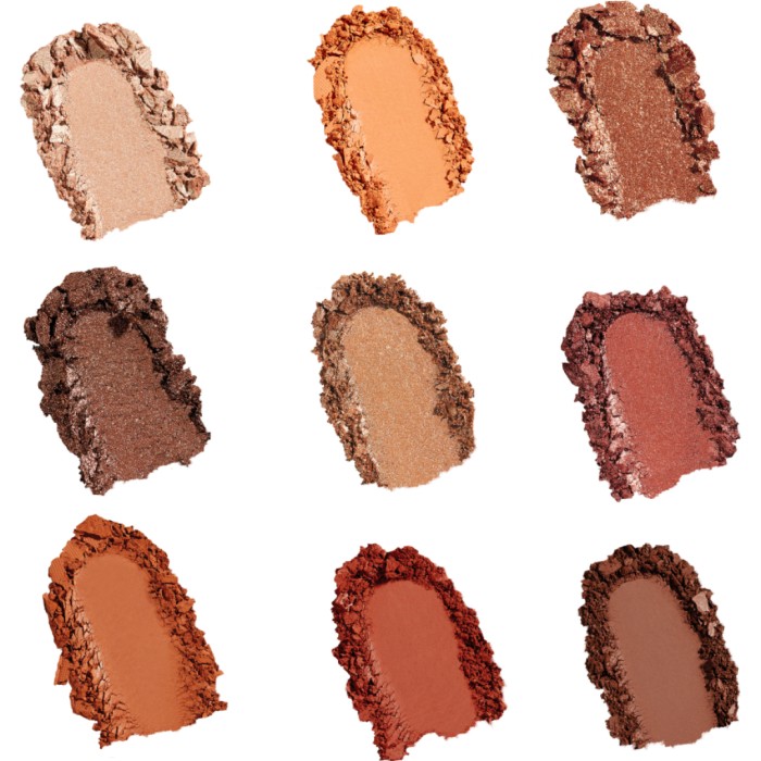 Fiery Palette innehåller: Breezy (Intensiv kokosnöt, metallic), Apricot (Dov honung, matt), Campfire (Varm sandsten, metallic), Truffle (Fyllig kanel, metallic), Sunsprite (Ljus ringblomma, skimmer ), Scorched (Rik scharlakansröd, metallic), Paradise (Rusty Sedona, matt), Summer Song (Bränd orange, matt) samt Roasted (Pecannötbrun, matt).