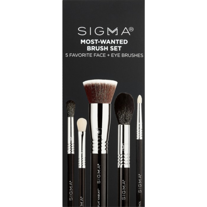 Sigma Beauty Most Wanted Set är en samling av Sigmas mest populära sminkborstar för ansiktet. Med dessa borstar kan du skapa en perfekt bas, framhäva ansiktet med en highlighter-effekt och blanda samman ögonskuggor på ett stilfullt sätt. I kitet ingår Sigma Beautys tre mest populära ögonskuggsborstar.