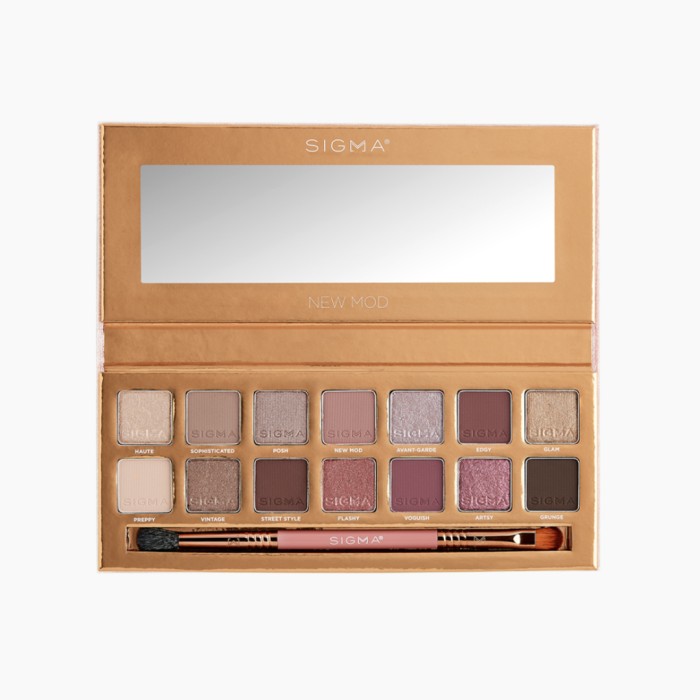 New Mod Eyeshadow Palette från Sigma Beauty innehåller 14 st ögonskuggor i dosa med en dubbeländad borste och spegel. En palette med ett à la mode-utbud av matta, skimrande och metalliska nyanser i silkeslena formuleringar.