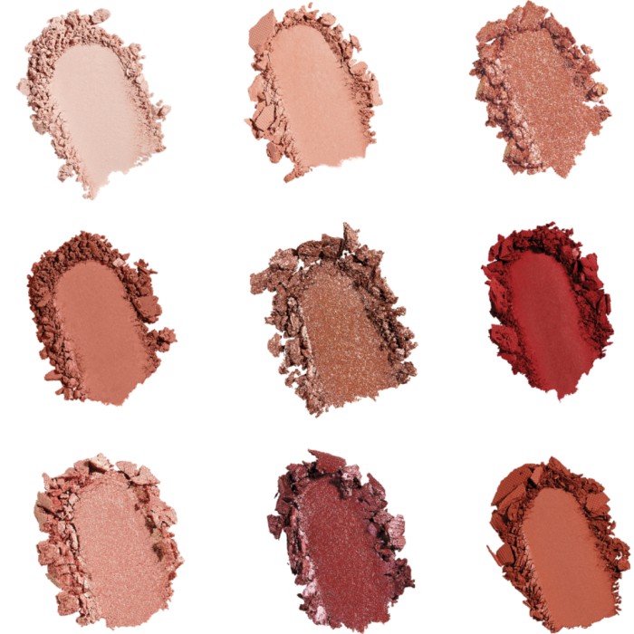 Paletten som heter Rosy innehåll skuggorna: Demure (Babyrosa, matt), Primrose (Mjuk blush, matt), Flutter (Rosaaktig guld, metallic), New Mod (Nude mauve, matt), Morganite (Roséguld, shimmer), Poppy (Rödaktig vinbär, matt), Fantasy (Roséguld, duokrom), Regal (Candy red, metallic) samt Jasper (Djup granat, matt).