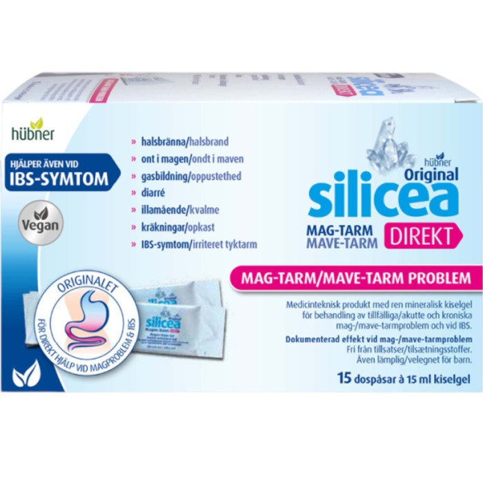 Silicea Mag-Tarm Direkt är en kiselgel som kan användas vid halsbränna. Kiselgelen verkar skyddande och absorberande. Kan även användas vid magproblem som uppkördhet, gaser och ont i magen. Utan smak och lukt.