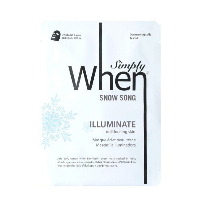 Simply When Snow Song ansiktsmask är ett ark tillverkat av det mjuka bomullsmaterialet Bemliese™ (bomullslinter). Arket är doppat i en lätt essens formulerad med niacinamide och C-vitamin, för att minska synligheten av mörka fläckar och åldersrynkor.