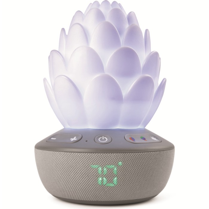 Succulent Glow Nattlampa med gråtsensor är en nattlampa som både blir en prydnad i barnets rum och som fungerar som trygghet när barnet ska sova. Skip Hops nattlampa kan spela åtta melodier och lugnande ljud och har automatisk avstängning efter 15, 30 eller 60 minuter. När musiken tystnat finns ett läge man kan välja, där nattlampan aktiveras igen om barnet gråter. Du kan även spela in din egen röst som extra tröst för barnet. Nattlampan kan lysa i sju olika färger och har även ett läge där den skiftar i färg. Både ljud- och ljusstyrkan kan justeras. Rummets temperatur visas på nattlampans bas.