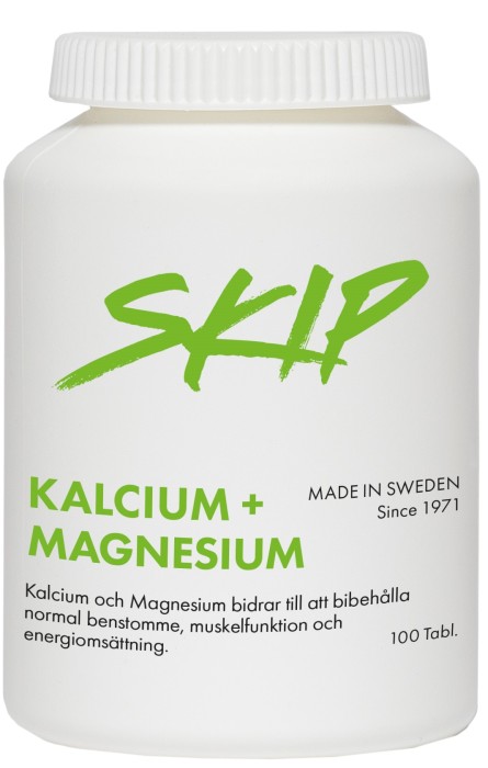 Skip Kalcium Magnesium är ett kosttillskott med 300 mg kalcium och 150 mg magnesium i tabletter utan dragering eller coating.