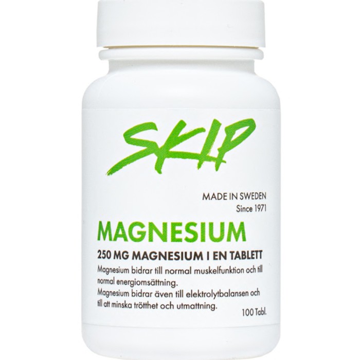 Skip Magnesium är ett kosttillskott med 250 mg magnesium per tablett. Tabletten innehåller en blandning av magnesiumoxid och magnesiumcitrat.