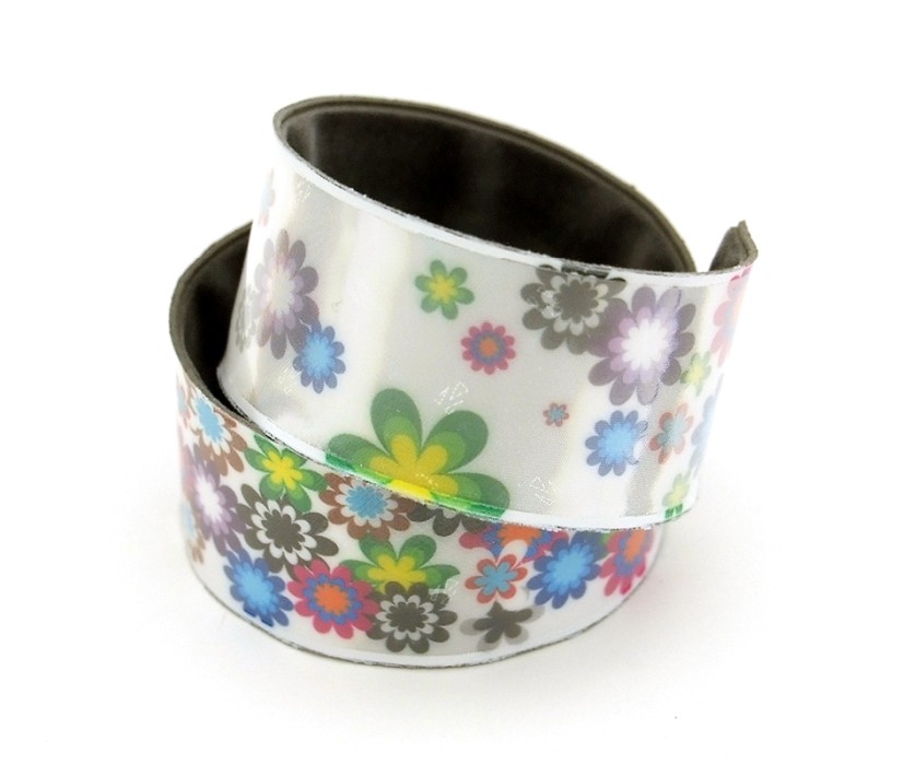 Slapwrap är en reflex som du slår kring armen eller benet som gör att du syns bra på långt håll i mörkret. Denna reflex har ett härligt flower power-motiv och piggar upp promenaden i mörkret.