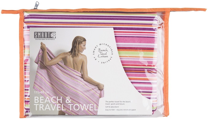 Smart Beach & Travel Towel är en resehandduk tillverkad av högabsorberande mikrofiber. Handduken är tunn, lätt och tar liten plats i väskan. Smart Beach & Travel Towel har hög uppsugningsförmåga och torkar snabbt. Den är perfekt att ta med på semestern, stranden och parken. Dess yta gör att gräs och sand inte fastnar lika lätt som på en vanlig handduk. Produkten kan tvättas i 40 grader. Använd inte sköljmedel.