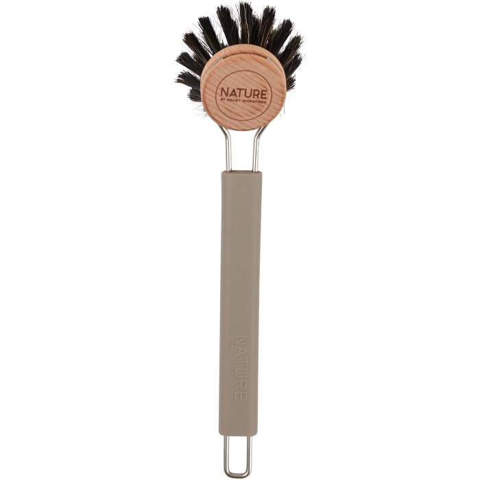 Smart Microfiber Diskborste Grå i silikon/tagel har ett bekvämt silikonhandtag och ett borsthuvud i FSC-märkt bokträ med tagelmixborst. Denna diskborste är skonsam vid diskning av silver, glas och kristall, men samtidigt effektiv vid rengöring av kastruller och stekpannor. Borsthuvudet är utbytbart och byts enkelt ut genom att dra av silikondelen från handtaget, lossa borsthuvudet och trä på ett nytt. Diskborsthuvud Refill tagel finns att köpa till.