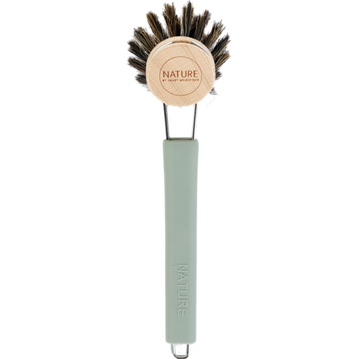 Diskborste i silikon/tagel med ett bekvämt silikonhandtag och ett borsthuvud i FSC-märkt bokträ med tagelmixborst. Använd för en skonsam diskning av silver, glas och kristall. Är också effektiv för att diska kastruller och stekpannor.