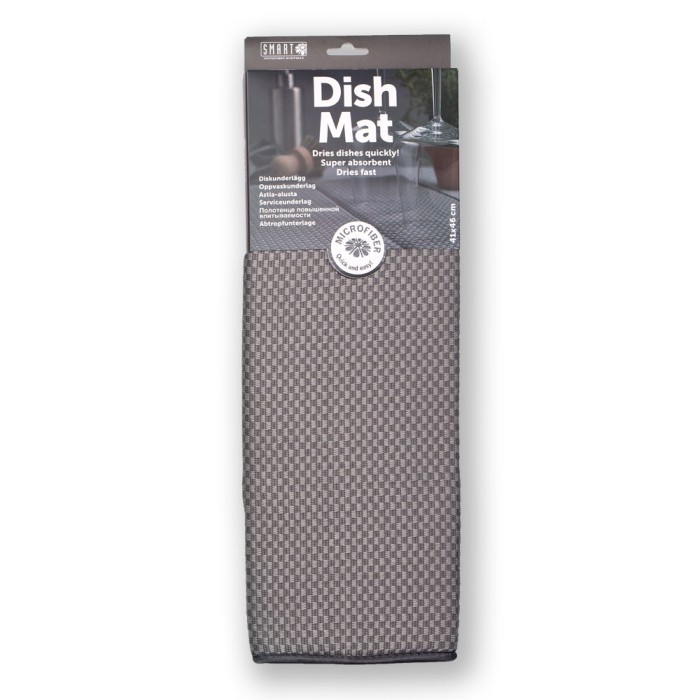 Smart Microfiber Diskunderlägg är tillverkat i högabsorberande mikrofiber och är perfekt när du ska torka grytor, kastruller och porslin. Underlägget passar särskilt bra till ömtåligare disk som du inte vill ställa i diskmaskinen, som finporslin eller kristallglas. Både mattan och disken torkar snabbt, utan att lämna imma på ytor.