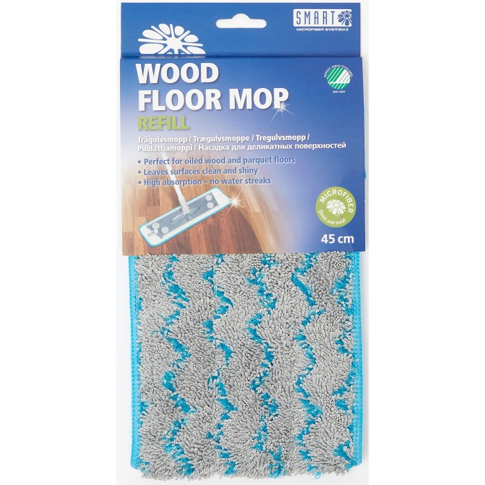 Smart Microfiber Trägolvsmopp refill kan användas för rengöring av oljade trägolv och parkett. Trägolvsmoppen är en lågfriktionsmopp i microfiber som lämnar minimalt med vätska på golvet. Tar bort intorkade fläckar, lös smuts, damm, katt- och hundhår. Vrid ur golvmoppsduken i ljummet vatten, fäst på moppen (skaft ingår ej) och moppa i s-rörelse. Kan också användas torr som dammopp.