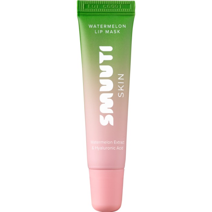 Smuuti Skin Watermelon Lip Mask är en mjukgörande och närande mask för läpparna. Du kan applicera läppmasken på läpparna antingen över natten, eller använda den på dagen vid behov. Läppmasken innehåller vattenmelon och hyaluronsyra. Kan användas dagtid som ett läppbalsam/läppglans eller som en "Lip Sleep-mask" på kvällen så att den för verka under natten. Den rikare formuleringen ger näring åt läpparna medan du sover. En närande läppmask som passar för alla hudtyper för att förhindra spruckna och torra läppar