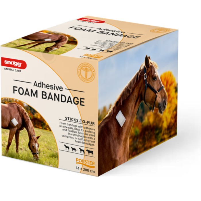 Snögg Animal Foam Bandage Adhesive är ett tvärelastiskt förband som är anpassat för djur. Förbandet har lim på ena sidan och den andra sidan är klädd med porös skumplast. Bandaget kan ha bra vidhäftning på päls och hud och kan passa idealiskt för att fästa förband eller fixering av sårmaterial. Ska inte läggas direkt på såret.