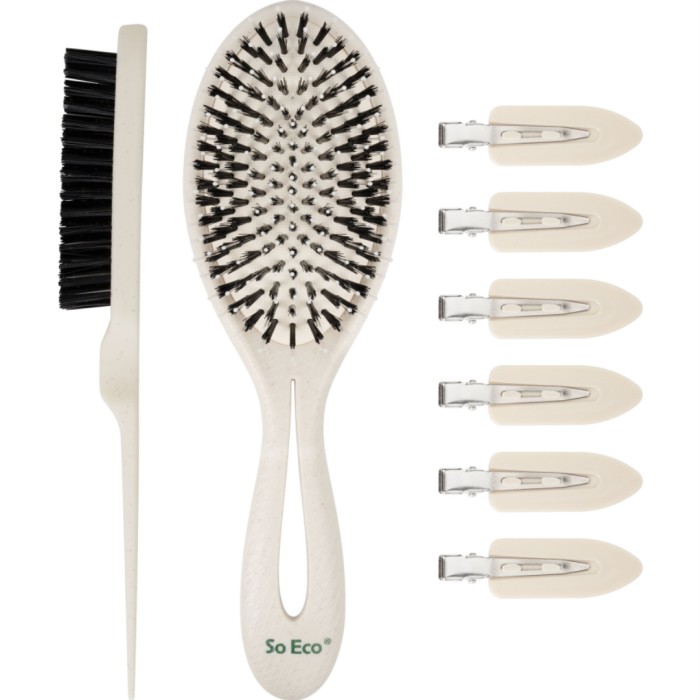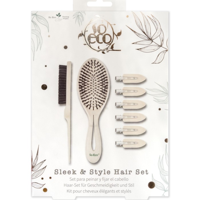 So Eco Sleek & Style Hair Set är ett kit med två hårborstar och 6 st clips. Addera volym och textur till håret med Back Combing Brush. No Crease-klämmorna är utformade för att hålla håret på plats medan du stylar, så att du lättare kan få din önskade look.