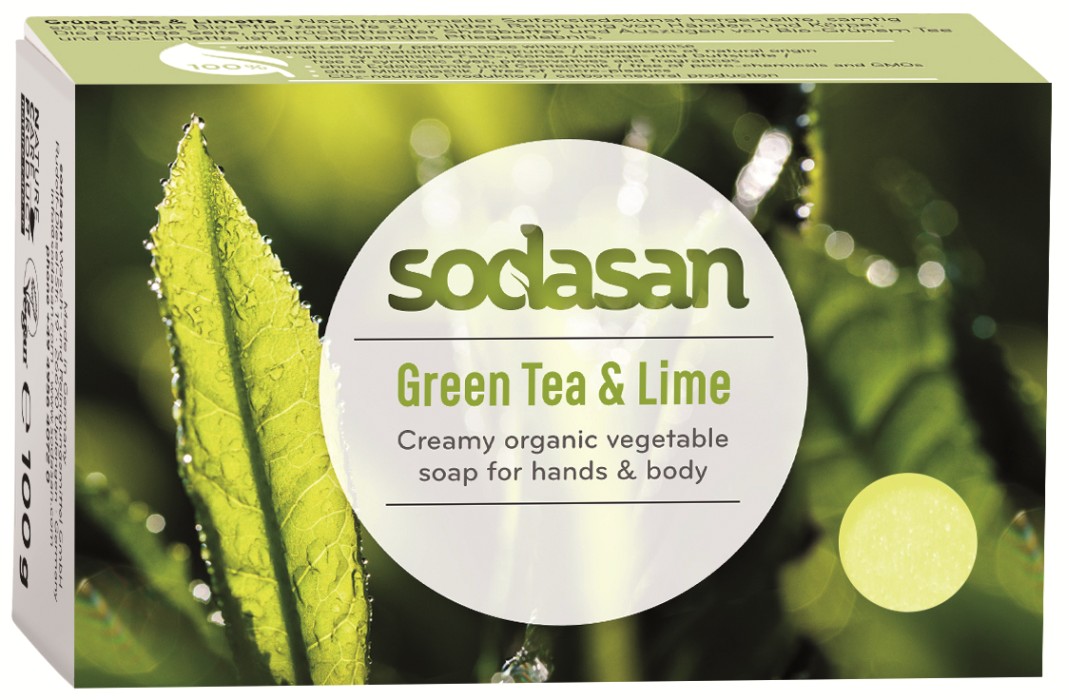 Sodasan Green Tea & Lime är en vegetabilisk tvål för händer och kropp. Sodasans grönt te & lime-tvål är tillverkad på traditionellt vis och ger ett lent skum. Tvålen innehåller fuktgivande sheasmör och extrakt av grönt te och lime vilket ger tvålen en uppfriskande doft.