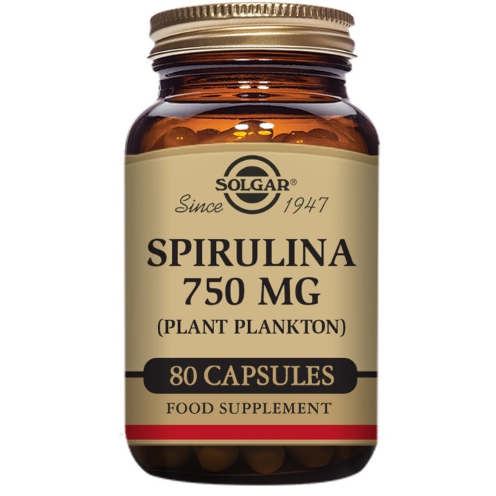 Solgar Spirulina är ett kosttillskott med algen spirulina, en blågrön sötvatten-alg med en intensiv smak. Spirulina används både för att göra kosttillskott, och som livsmedel på vissa håll. Spirulina (arthrospira platensis) användes förr som mat hos aztekerna och mesoamerikanerna.