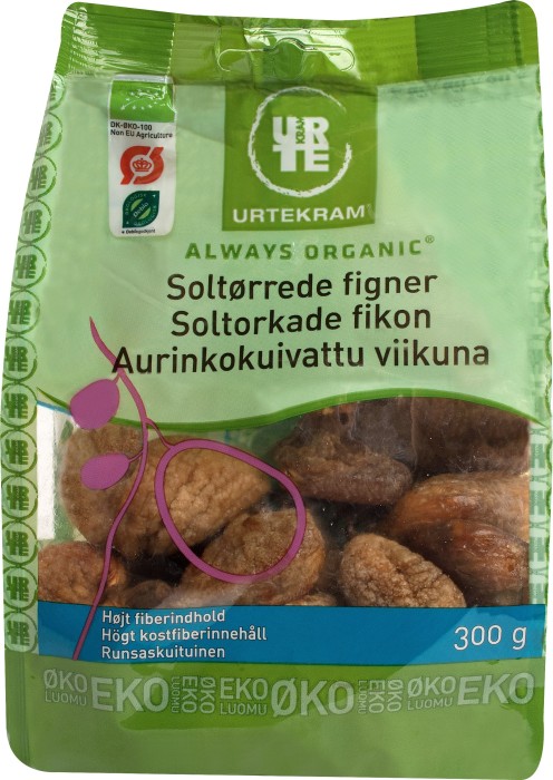 Urtekrams soltorkade fikon är handsorterade ekologiska fikon från Turkiet. Fikon ger ett naturligt tillskott av sunda kostfibrer. Torkade fikon kan ätas som de är, som snacks, eller hackas till små fikontärningar och användas i gröten för lite extra sötma. Kravmärkta. Ekologiskt certifierad enligt EU-lövet.