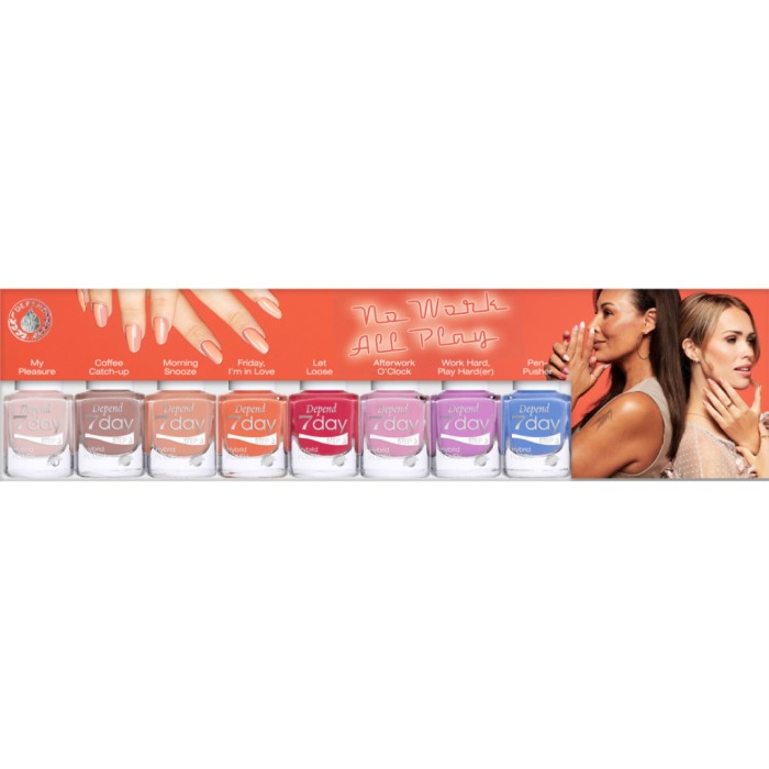 Depend 7day är lacksystemet för dig som vill ha nagellack med superglans, hållbarhet och en ”gel-feeling”. Depends hybridformulering håller i upp till en vecka. Det är lätt att applicera och är enkelt att ta bort med Depends nagellackremover. Du behöver inte någon LED-/UV-lampa - lacksystemet härdar i normalt dagsljus/lampljus. Flaskorna har symboler som visar lackets täckningsgrad: täckande, halvtäckande eller transparent.