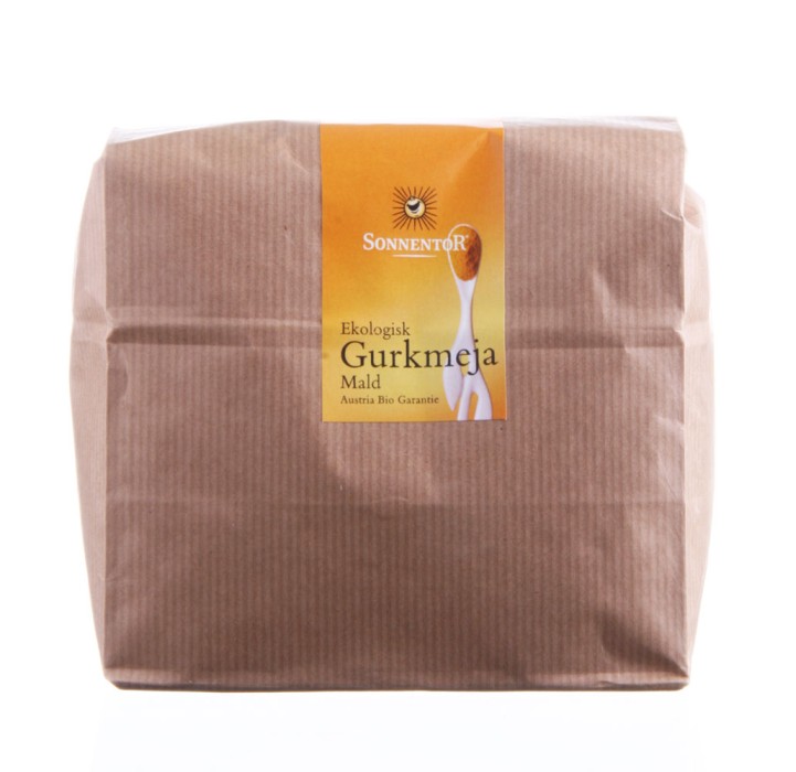 Guldgul ekologisk mald gurkmeja från Sonnentor. Kan användas som krydda i mat och dryck. Innehåller 2,9 g kurkumin per 100 g.