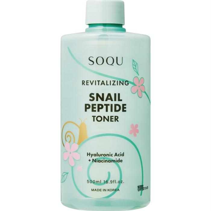 SOQU Snail Peptide Toner är ett lätt och återfuktande ansiktsvatten berikat med snigelsekret och peptider. Tonern bidrar med att ge huden näring och stimulerar hudens kollagenproduktion. Tonerns ingredienser bidrar till att återställa hudens ph-balans efter din dagliga rengöring och gör huden återfuktad med ökad lyster.