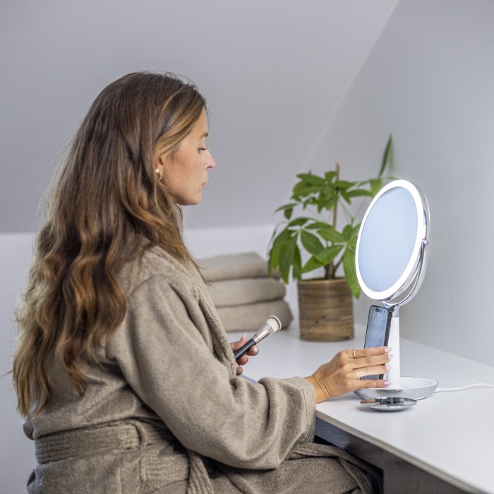 Spegeln har en inbyggd LED-halo-ljusring om du behöver mer ljus på ansiktet. Ljuset kan dimmas och justeras med en enkel knapptryckning.