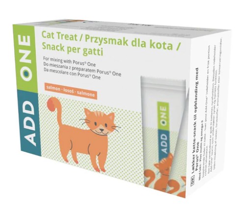 Som bas för inblandning av Porus One vid utfodring med torrfoder. Blanda Add One med Porus One och servera katten separat före den dagliga utfodringen med torrfoder. Förvaras svalt och torrt. Ge fodret rumstempererat och se till att det alltid finns rikligt med dricksvatten.