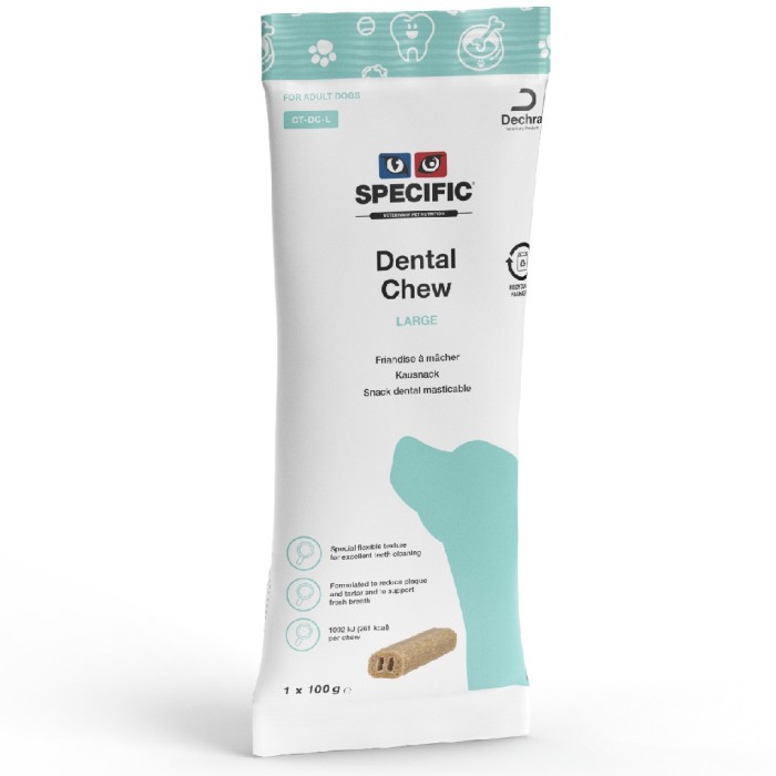 Specific Dental Chew Large är tuggpinnar för hundars munhälsa. Tuggpinnarna har en speciell, flexibel konsistens och öppen struktur. Detta gör att hundens tänder kan tränga djupt in i tuggpinnen vilket hjälper till att skrapa tänderna renare.