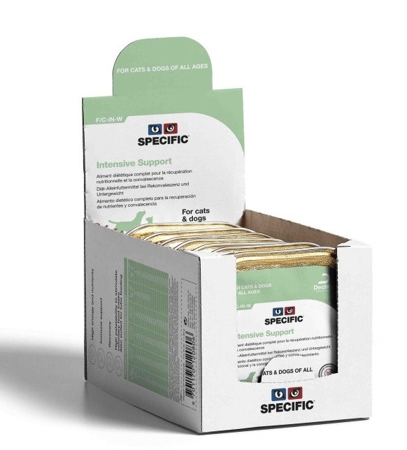 Specific Intensive Support är ett helfoder för katter och hundar som är speciellt utformat för initial näringsmässig restaurering och konvalecens. Fodret har en ökad proteinninvå och innehåller höga halter av viktiga aminosyror, ökat innehåll av zink samt höga halter omega-3 fettsyror. Fodret täcker alla de näringsmässiga behoven hos vuxna katter och hundar och främjar deras hälsa.