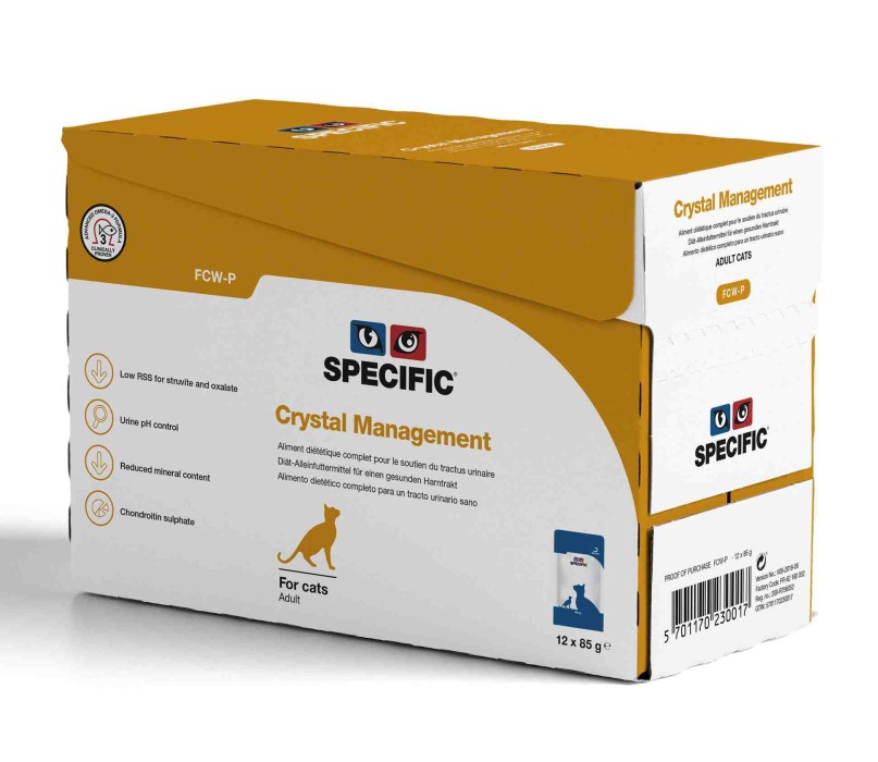 Spedific Crystal Management är ett helfoder till vuxna katter för minskning av risken för att det bildas ny struvitsten och FLUTD (feline lower urinary tract disease). Fodret har urinförsurande egenskaper och måttliga halter magnesium. Fodret tillgodoser alla näringsbehov hos vuxna katter och främjar deras hälsa.