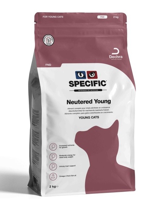 Specific FND Neutered Young är ett komplett balanserat helfoder för kasterade ungkatter. Fodret har ett anpassat energiinnehåll och motverkar övervikt efter kastering. Fodret täcker alla de näringsmässiga behoven hos kastrade ungkatter främjar deras hälsa.