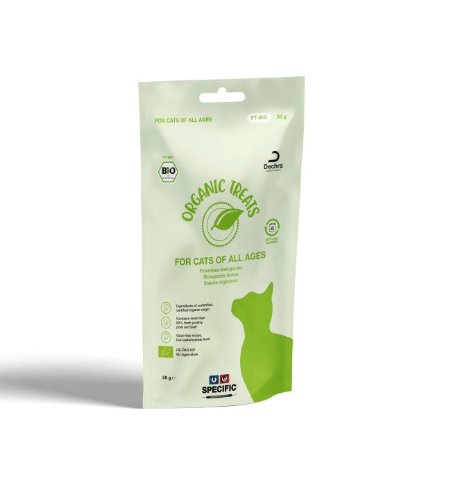 Specific Organic Treats är välsmakande ekologiska godbitar för katter i alla åldrar. Använd godbitarna som kompletteringsfoder för att belöna din katt. Kan ersätta max 10-15 % av kattens energibehov. Minska den dagliga foderransonen efter hur många godbitar du gett för att undvika övervikt.