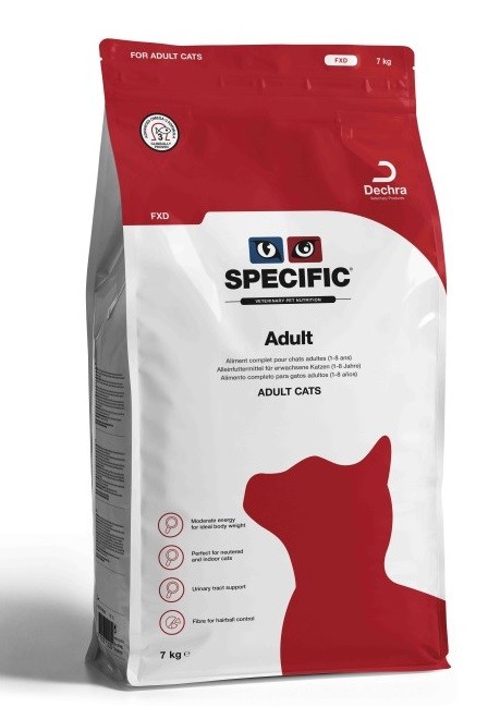 SPECIFIC™ Adult är ett komplett och näringsmässigt balanserat foder för vuxna katter. Med höga nivåer av omega-3 från fisk, måttlig energinivå som kan hjälpa katten att bibehålla en idealisk kroppsvikt samt ingredienser som kan stödja friska urinvägar och hjälpa till att förebygga hårbollsproblem.